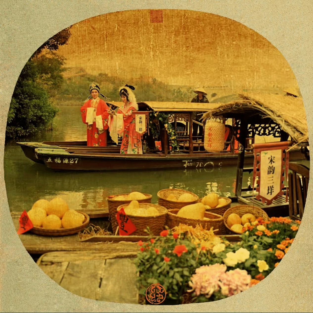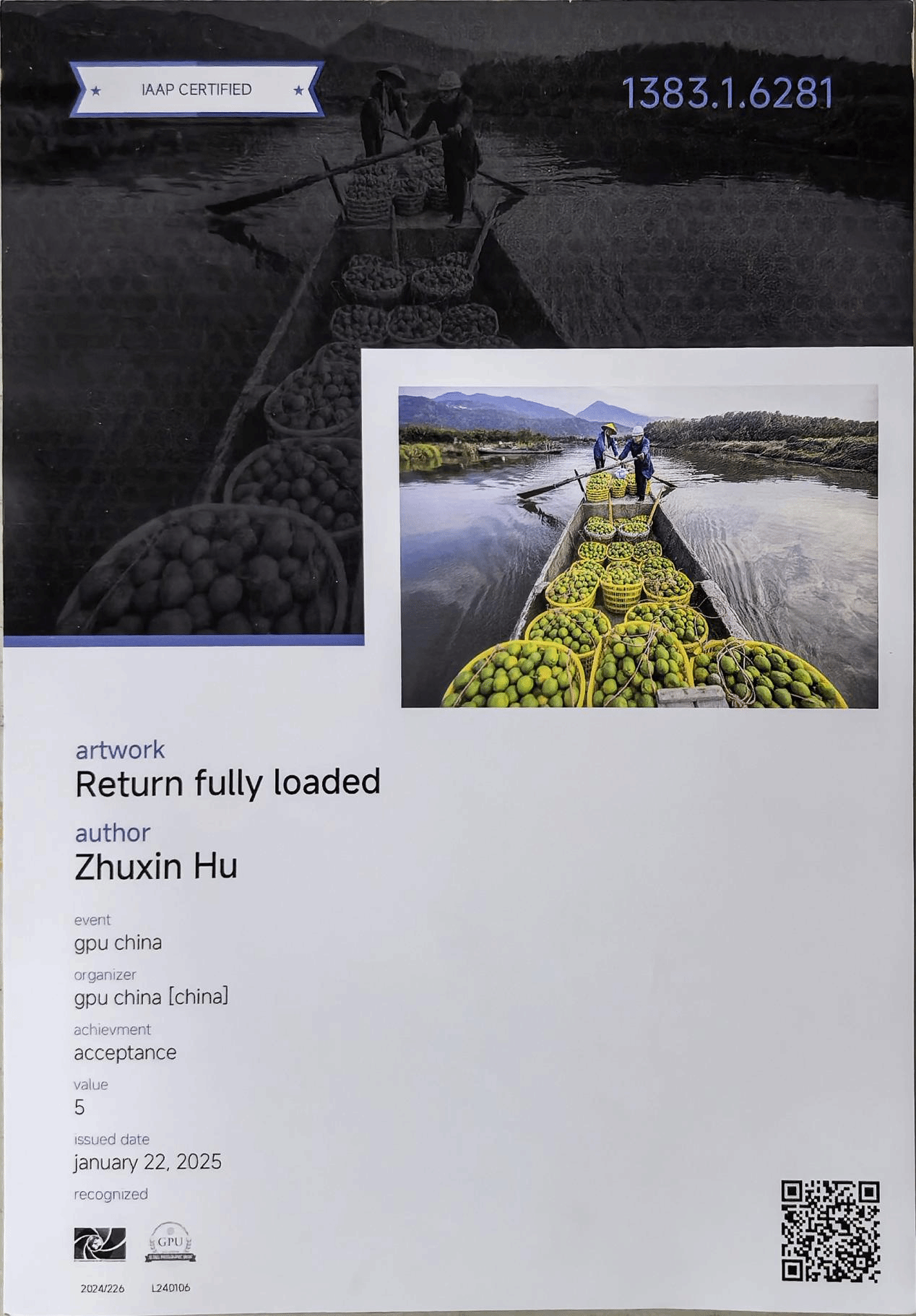 此次展出的两幅作品均源于胡铸鑫副教授对于家乡温州的创作。《塘河瓯柑》通过光影的交织,捕捉了江南水乡的质朴船工。近处黄绿相间的温州塘河特产瓯柑堆得满满当当,远处山峦与葱郁树木相映成趣,构图巧妙,色彩和谐,传递出浓郁的生活气息与自然之美,该作品还入围GPU CHINA 国际摄影大赛;而《江南宋韵塘河》这幅作品宛如时光绘卷,将江南宋韵娓娓道来。塘河悠悠,古舟静泊,身着古装的人物仪态优雅,似在谈诗论画。岸边果蔬丰饶、繁花似锦,色彩明艳。画面构图精巧,古意盎然,于方寸间勾勒出江南水乡的温婉灵秀与宋代风雅。展现了劳动者风采、山水意境及文化交融,与本次“视界·无界”的主题“用镜头诠释多元视角,捕捉跨越国界与文化的精彩瞬间”高度契合。