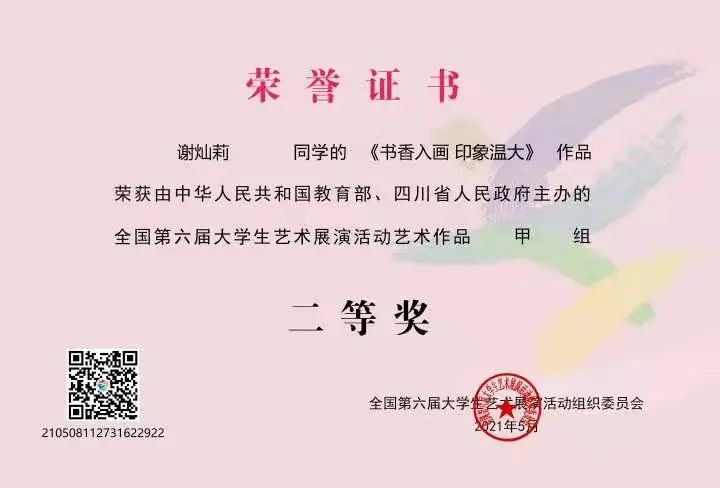 7月22日,教育部办公厅发布了《关于公布全国第六届大学生艺术展演活动优秀组织奖及各项目评选结果的通知》,财神捕鱼 在本次活动中成绩显著,斩获6项全国一等奖、1项二等奖、2项三等奖,2件作品获全国优秀作品创作奖,并获全国高校优秀组织奖。财神捕鱼 在本届大艺展中一等奖获奖数量位列全国第一,获奖总数量位列浙江高校首位。其中财神捕鱼 学子在全国第六届大学生艺术展演活动中斩获5项奖项: