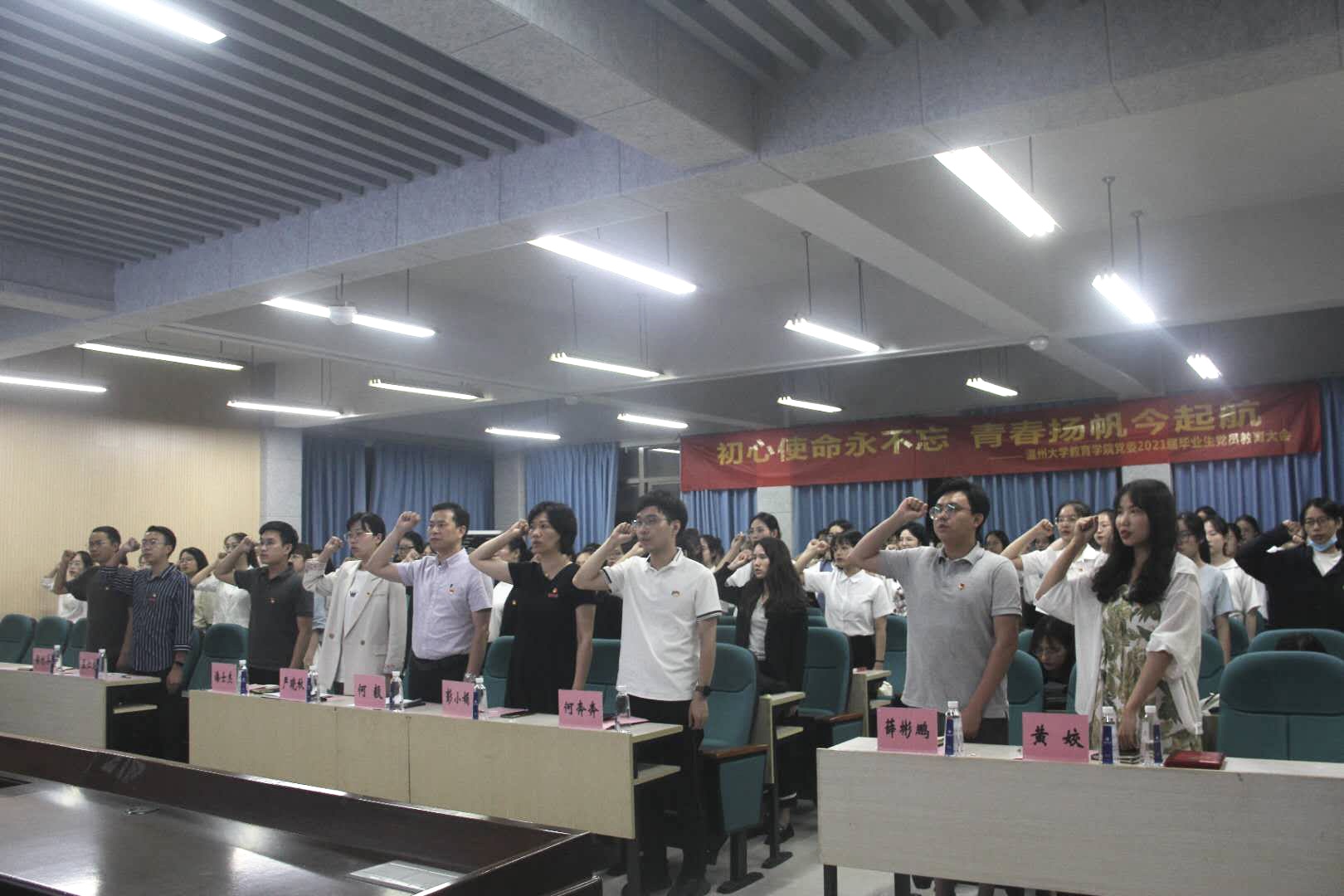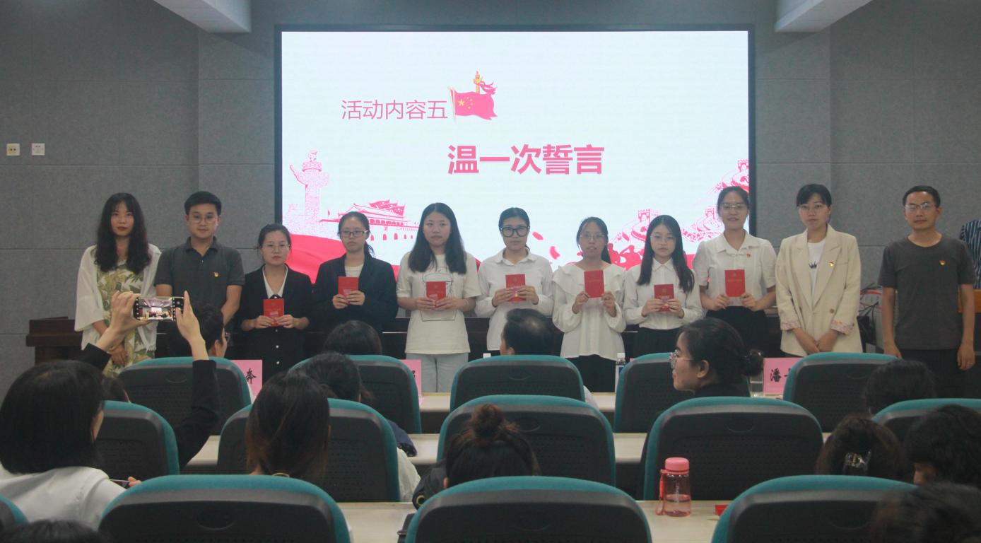 温一次誓言。各学生党支部书记为新党员佩戴党徽,赠送党章。全体党员一起重温入党誓词,并学习入党誓词歌《我宣誓》,大家必将这段誓词铭记于心,落实到自己的实际行动上。