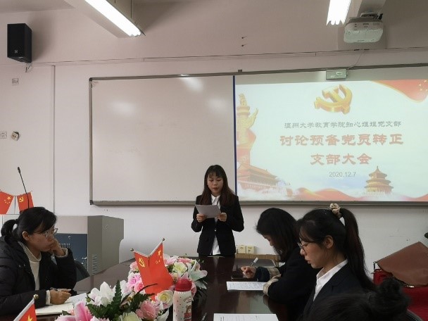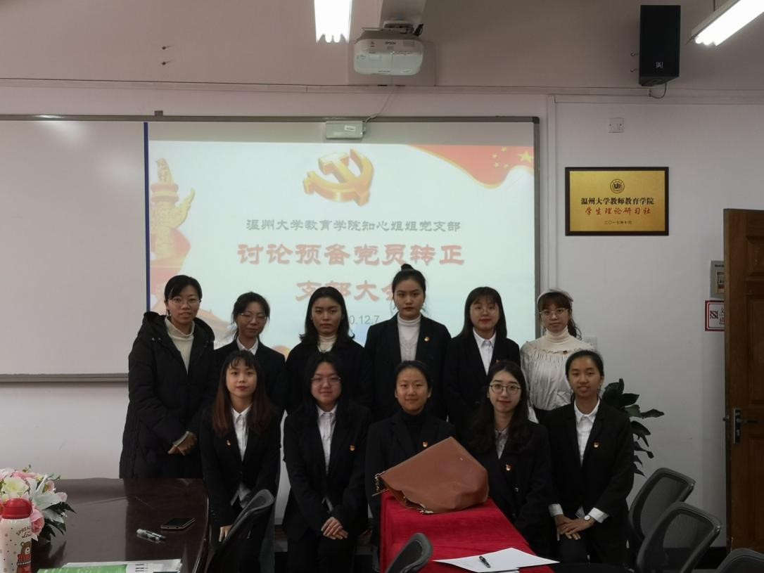 2020年12月7日,知心姐姐党支部中共预备党员转正大会在财神捕鱼 9A204举行,会议由徐嘉浠同志主持,该支部全体党员参与此次会议。经党支部大会决议,一致同意周胜男同志按期转为中共正式党员。