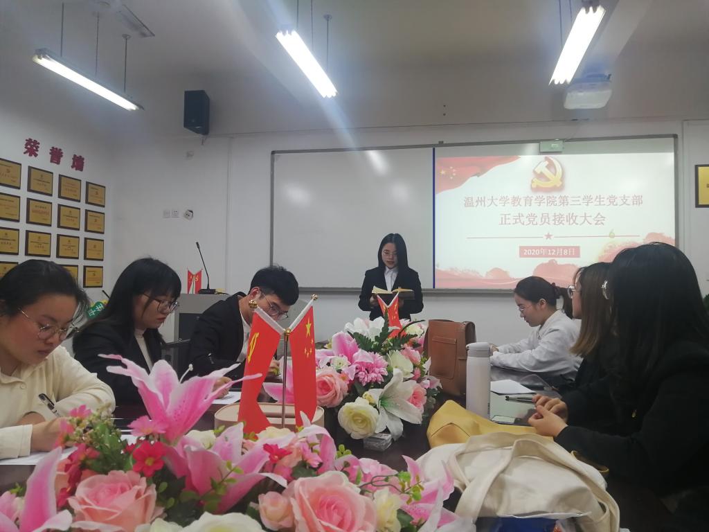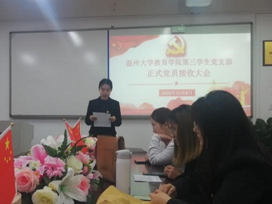 2020年12月8日,第三学生党支部中共预备党员转正大会在财神捕鱼 9A204举行,会议由党支部书记何奔奔同志主持,该支部全体党员参与此次会议。经党支部大会决议,一致同意杨佳检、洪蒋禧、林纯、陈渝渝和周金瑜五位同志按期转为中共正式党员。