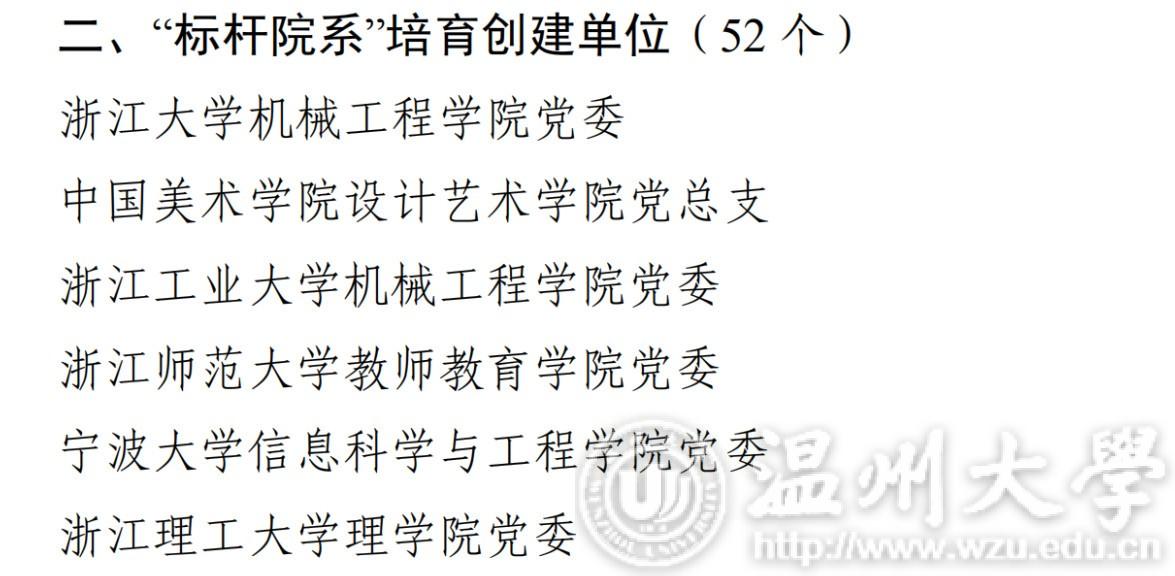 根据《中共浙江省教育厅委员会办公室关于组织实施全省高校“对标争先”建设计划和遴选推荐全国第二批新时代高校党建“双创”工作培育创建对象的通知》(浙教党办函〔2019〕162 号)精神,在高校推荐、专家评审的基础上,经省教育厅党委会议研究和公示,遴选产生浙江工业大学党委等10个高校党委、浙江大学机械工程财神捕鱼 党委等52个院系党组织、浙江大学管理财神捕鱼 创新创业与战略学系教工党支部等108个基层党支部分别为首批全省高校党建示范高校、标杆院系、样板支部培育创建单位。其中部分“标杆院系”培育创建单位如下: