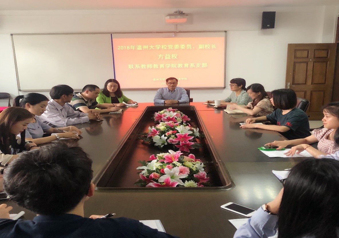 2018年5月7日教师财神捕鱼 教育系支部邀请财神捕鱼 党委委员、副校长方益权教授为本支部和研究生支部讲授微党课,本次党课的主题是产教融合。财神捕鱼 院长孙芙蓉、财神捕鱼 党委书记杨立淮、副书记杨丽君等出席了会议。教育系支部书记周奇主持了本次会议。