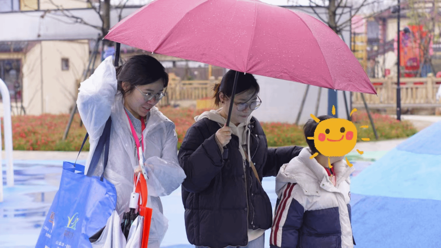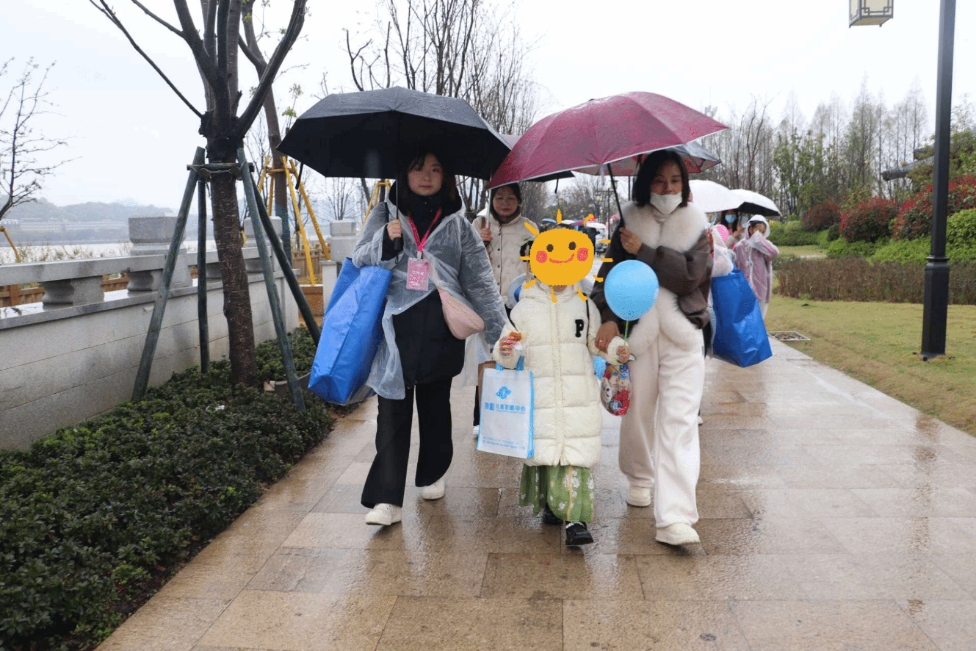 到达活动签到口后,雨幕渐密,小橄榄们利落地换上透明雨衣,红色的工牌在胸前摇曳,好似他们心中跃动的温暖火苗。志愿者们不约而同地在雨棚下筑起一道坚固的围墙——有人反复擦拭着签到台的雨渍,而更多人在雨棚下排起了整齐的队伍,目光穿透雨幕织就的轻纱,满心期待那群来自星星的小旅客的到来。