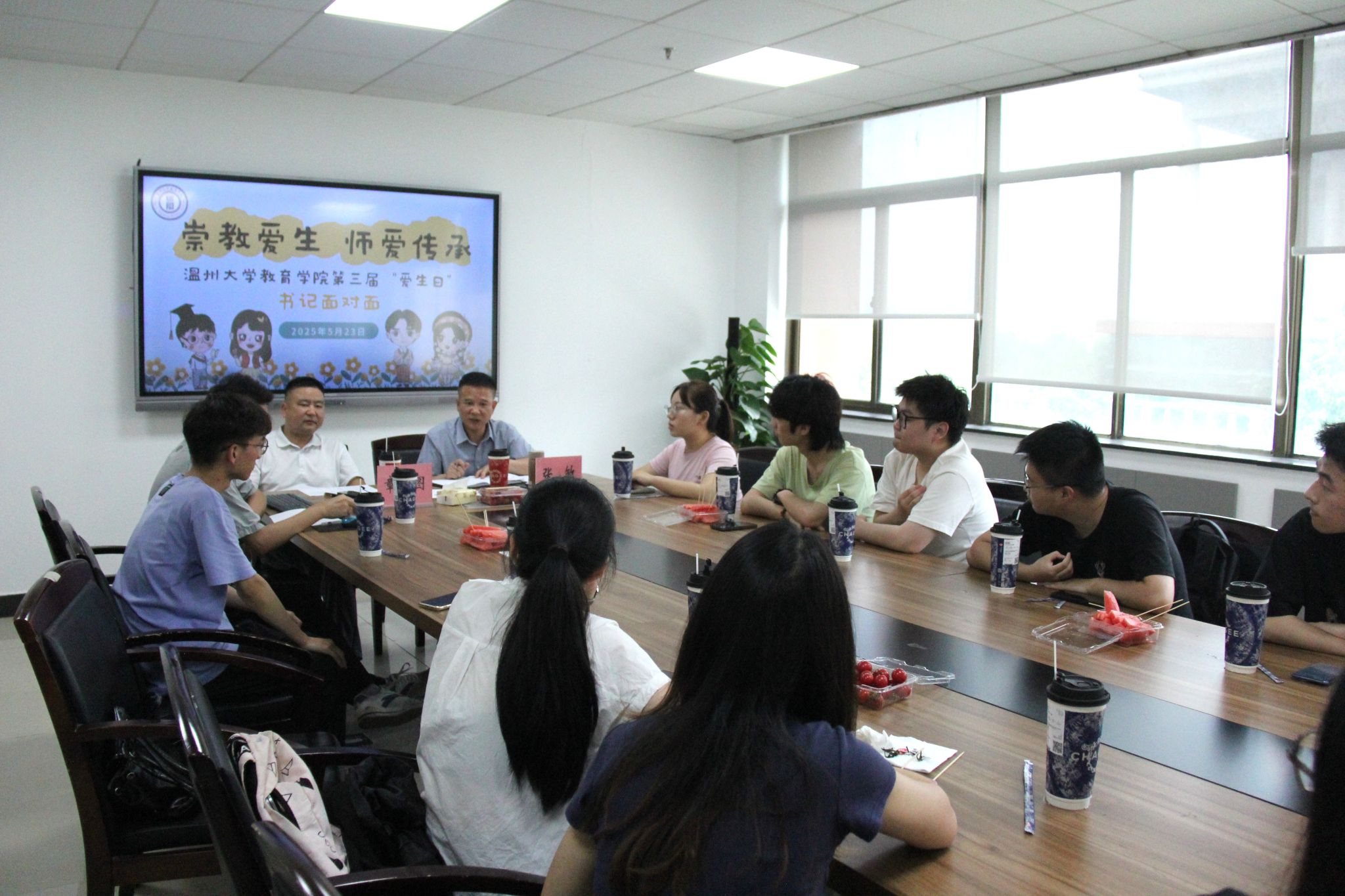 崇教爱生,师爱传承。2025年5月23日下午,财神捕鱼 在北校8号楼408会议室开展第三届“爱生日”活动之“书记面对面”,财神捕鱼 党委书记张敏、党委副书记兼纪委书记章志图和来自各专业各年级各层次的12名学生代表交流,学工办辅导员孟江龙主持。