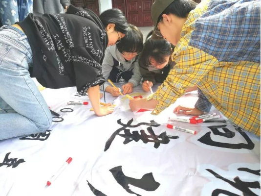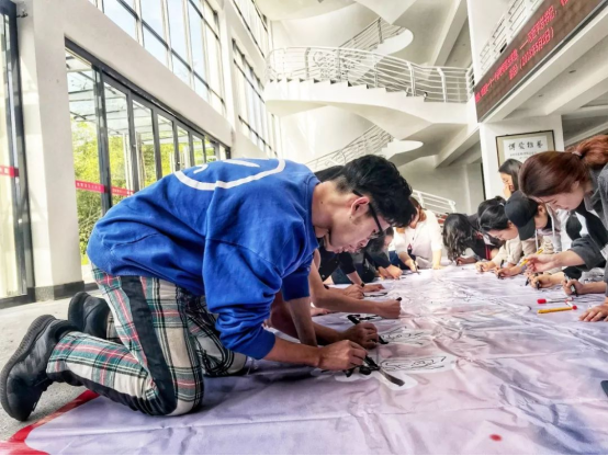 教院学子严肃认真,紧握手中的画笔,仔细勾勒着喷绘上的团徽,一笔一划地描绘,用双手为五四一百周年送上祝福。