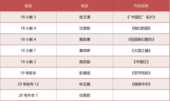 活动说明:可自行选择个人或小组报名参赛,需为祖国设计一张名片,名片可为电子版也可为实物。参赛者需要通过一张名片诠释你心目中的祖国母亲,表达心中的祖国形象。旨在展示祖国的繁荣昌盛,表达当代大学生对祖国的深切情感。获奖名单