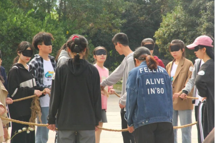 第二个项目为“盲阵”,其规则是让各位成员戴上眼罩,手拉手进行盲人初体验,随后用两根绳子围出一个正方形即为挑战成功。在项目过程中,成员们需要充分信任自己的队友,接收他们的信号来完成挑战。各位成员齐心协力,最终在规定时间内顺利完成了挑战。