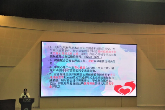 本次会议首先讲解了心理委员的职责和日常工作,要求心理委员能够掌握常见的心理问题和紧急干预的常识,主动关注班级学生心理状况,和同学进行交流并向班级同学普及心理健康和卫生方面的知识。此外,心理委员还要积极配合公寓心理部工作,及时向班级传达信息,有计划地开展班级心理教育活动。随后,会议又介绍了活动策划书和成果册的详细制作过程,进一步探讨班级心理活动开展方向,明确心理委员工作职责。