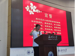 第四项议程是实践队代表张雨瑶同学发言并带领全体实践队队员宣誓。雨瑶同学的发言代表着全体实践队队员面对暑期实践工作的积极、努力付出的态度。也对暑期实践过程中自身的规范提出了要求与期许。