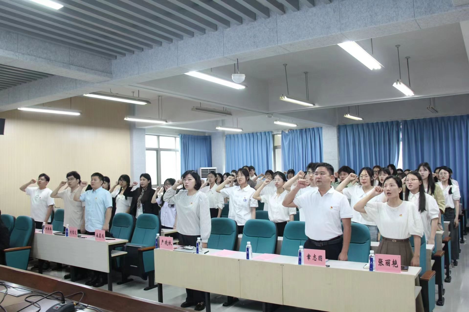 优秀学生党员代表王璐带领全体党员重温入党誓词,并学习入党誓词歌《我宣誓》,希望各位党员将入党誓词铭记于心,并落到实处,在思想上、工作中、生活中发挥先锋模范作用,让党旗在一线高高飘扬,让党徽在一线闪闪发光。