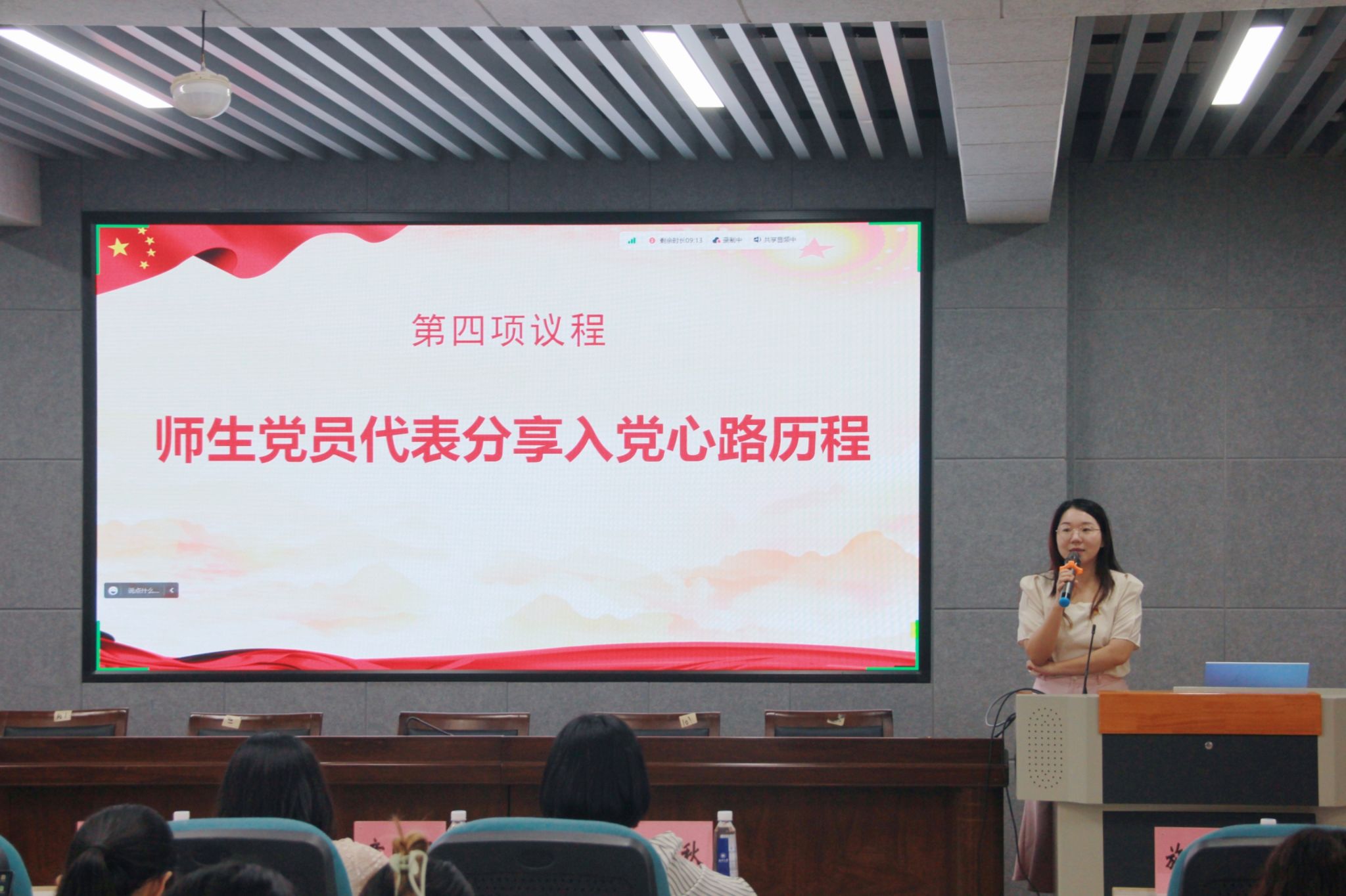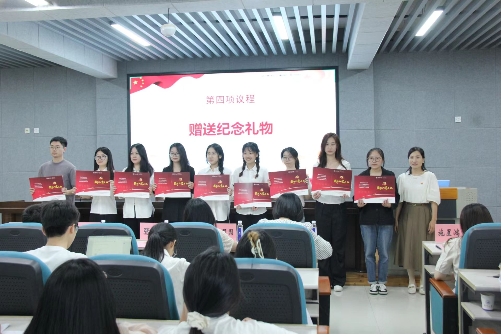 不忘初心,砥砺前行。会议回溯了毕业生党员代表的“入党志愿”,党龄15周年的第二学生党支部书记施星鸿老师、已入党5年并荣获财神捕鱼 2023年优秀学生共产党员的罗霞同学,作为师生党员代表分享了自己的入党心路历程,他们分享了自己的入党初心和在校期间的党员先锋模范作用发挥情况,让大家坚定自己的入党信念。回溯时光,初心不减,财神捕鱼 为每位毕业生党员准备了精美的纪念品礼物“我的入党之路”,张丽艳老师为毕业生党员代表赠送纪念品。