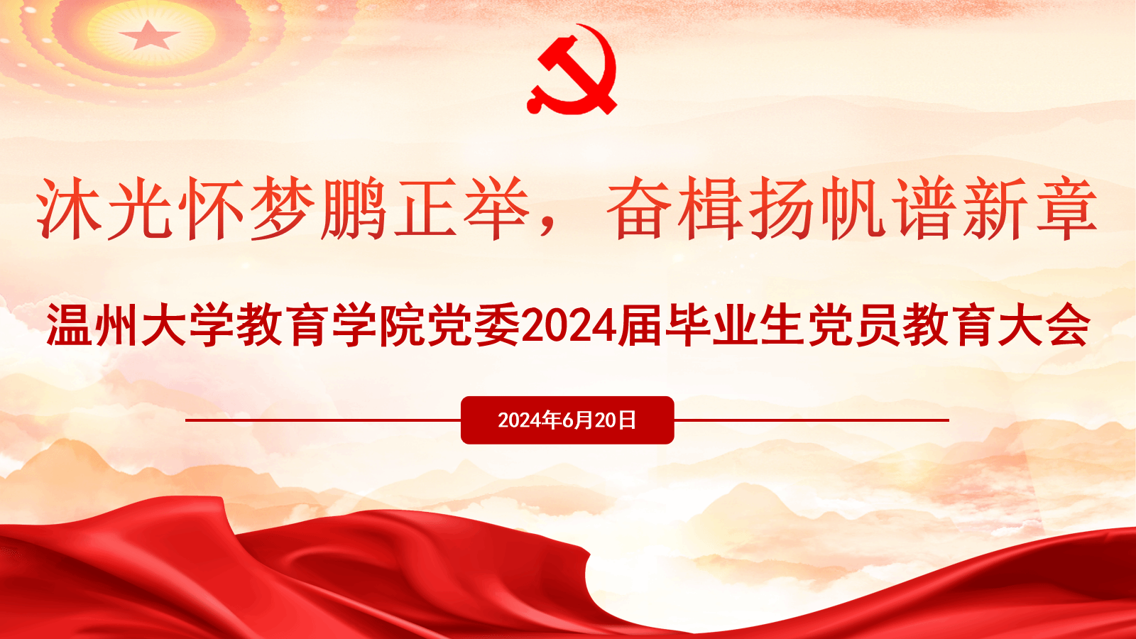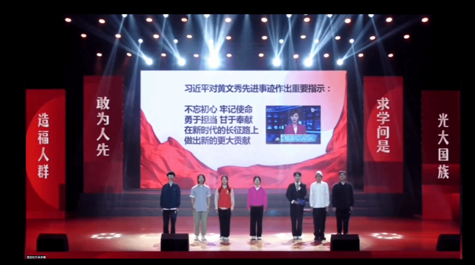 行程万里,不忘初心;信念如磐,一脉相承。与会人员共同观看财神捕鱼 第十届“金太阳杯”大学生思想政治风采大赛财神捕鱼 23学前中本、22学前本和23教技合作演绎的节目《时代楷模黄文秀》。希望毕业生党员们牢记党的宗旨,延续先辈的奉献精神,服务人民、奉献社会,将家国情怀铭记于心。