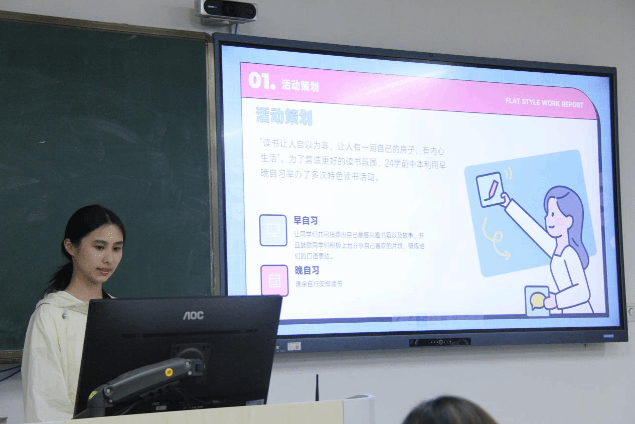 23小教2班同学以“逐梦之旅与心灵的绽放”为题,分享同学们对《茶花女》《骆驼祥子》《杀死一只知更鸟》等书籍剖析与理解,同时,还利用ai制作了一段视频,以阅读书籍传达成长祝福。