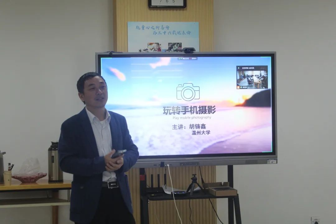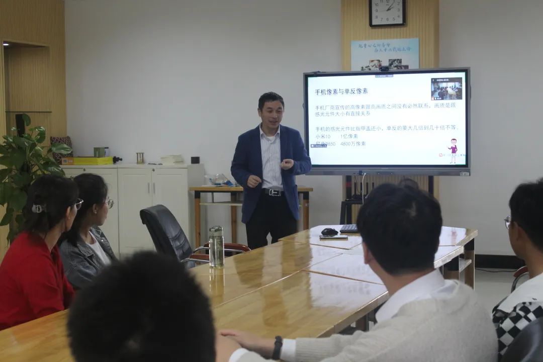 讲座伊始,胡铸鑫解释了手机摄影于我们当下生活的重要性和普遍性,以及开此次主题讲座的原因。接着胡铸鑫给听众们展示了手机摄影的优秀获奖作品,强调拍摄的重点是创意而非器材。他还通过图片和视频的形式带领教师和同学们直观感受到了手机像素和单反像素的差距——手机的感光元件更小,像素远不如单反。