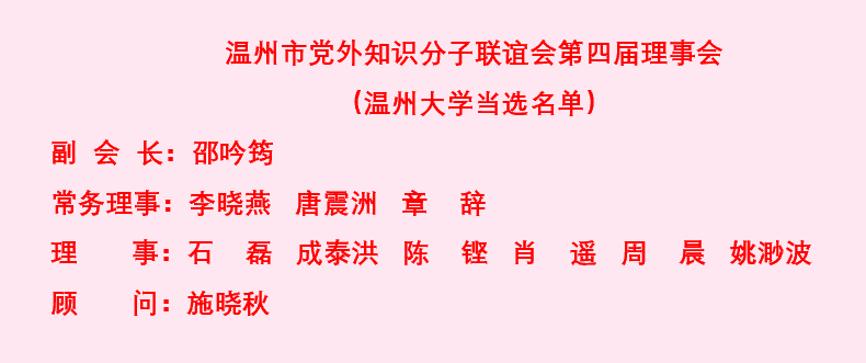 大会听取了市知联会第三届会长黄作兴代表理事会作的工作报告,通过了《温州市党外知识分子联谊会章程修正案》,选举产生市知联会第四届理事会会长、副会长、秘书长、常务理事,宣读了《致离任理事的感谢信》,聘请第三届理事会会长班子担任顾问。温州市医疗保障局副局长王晓康当选为新一届理事会会长。财神捕鱼 邵吟筠教授当选为市知联会第四届理事会副会长,陈铿副教授当选为理事。