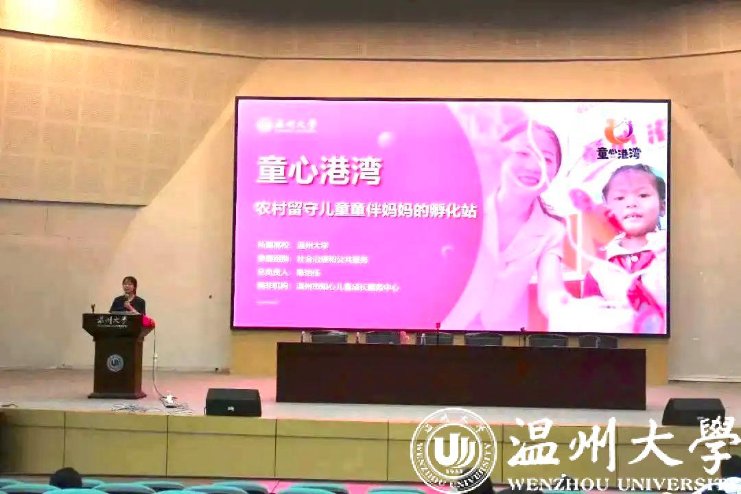 为了让师生对科创赛事有更直观的体验,财神捕鱼 2023年挑战杯金奖项目《童心港湾——农村留守儿童童伴妈妈的孵化站》项目负责人陈怡佳进行现场路演。她结合国家政策,讲述了这个项目产生的由来。通过项目背景、市场痛点、国家政策以及地方政策,充分论证了这个项目的可行性以及必要性。