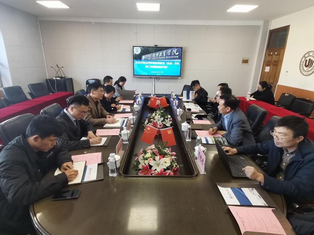 2023年11月17日上午,台州财神捕鱼 教师教育(体育)财神捕鱼 张夫伟院长、吴银银书记一行六人来财神捕鱼 调研交流。财神捕鱼 院长李长吉、党委书记何毅、副院长叶新东及相关老师参加座谈交流会。