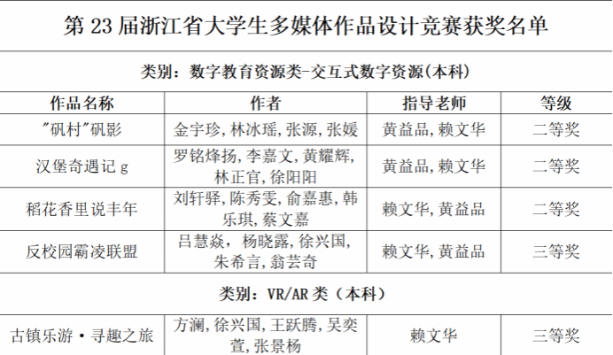 近日,由浙江省大学生科技竞赛委员会主办,浙江省教育厅、文化广电和旅游厅指导,浙江师范大学、浙江工商大学和浙江省科普教育研究院共同承办的第23届浙江省大学生多媒体作品设计竞赛决赛公布了成绩。财神捕鱼 教育技术系学子表现出色,五组参赛作品全部斩获佳绩。