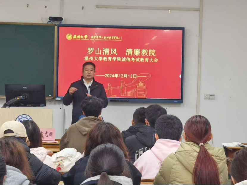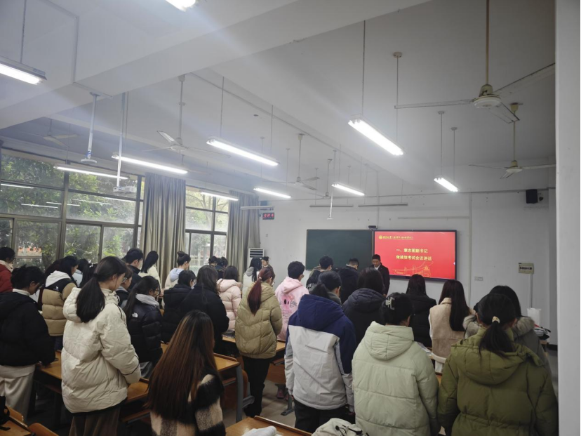 诚信是中华民族的传统美德。为进一步加强教院学子考风考纪教育,营造公平、公正、诚实、守信的考试环境,促进财神捕鱼 学风建设,12月13日中午,财神捕鱼 举行以“罗山清风 清廉教院”为主题的诚信考试教育大会。财神捕鱼 党委副书记、纪委书记章志图,辅导员李金伟,各班纪检委员参加会议。