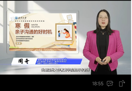 视频讲座中,周老师以习近平总书记在全国教育大会上的讲话作为导入,强调“家庭是人生的第一所财神捕鱼 ,家长是孩子的第一任老师,要给孩子讲好‘人生第一课’,帮助扣好人生第一粒扣子”。在寒假来临之际,周教授围绕“什么是亲子沟通、亲子沟通的困惑和常见问题”、“亲子沟通的有效方式”等问题,结合身边生活实例,阐述了“尊重理解”、“启发引导”、“积极倾听”“有效陪伴”、“平行交谈”、“榜样示范”等有效的沟通方式。有效的亲子沟通方式可以帮助家长更好地理解孩子,同时也能让孩子感受到家庭的温暖和力量。在视频的最后,周教授倡议家长朋友在寒假中珍惜与孩子相处的时光,用科学的方法和积极的态度与孩子进行沟通,帮助孩子度过一个充实而有意义的假期,愿所有的父母保持教育的初心,用智慧和情感培养出既有知识又有温度的孩子,成为孩子成长的引路人。