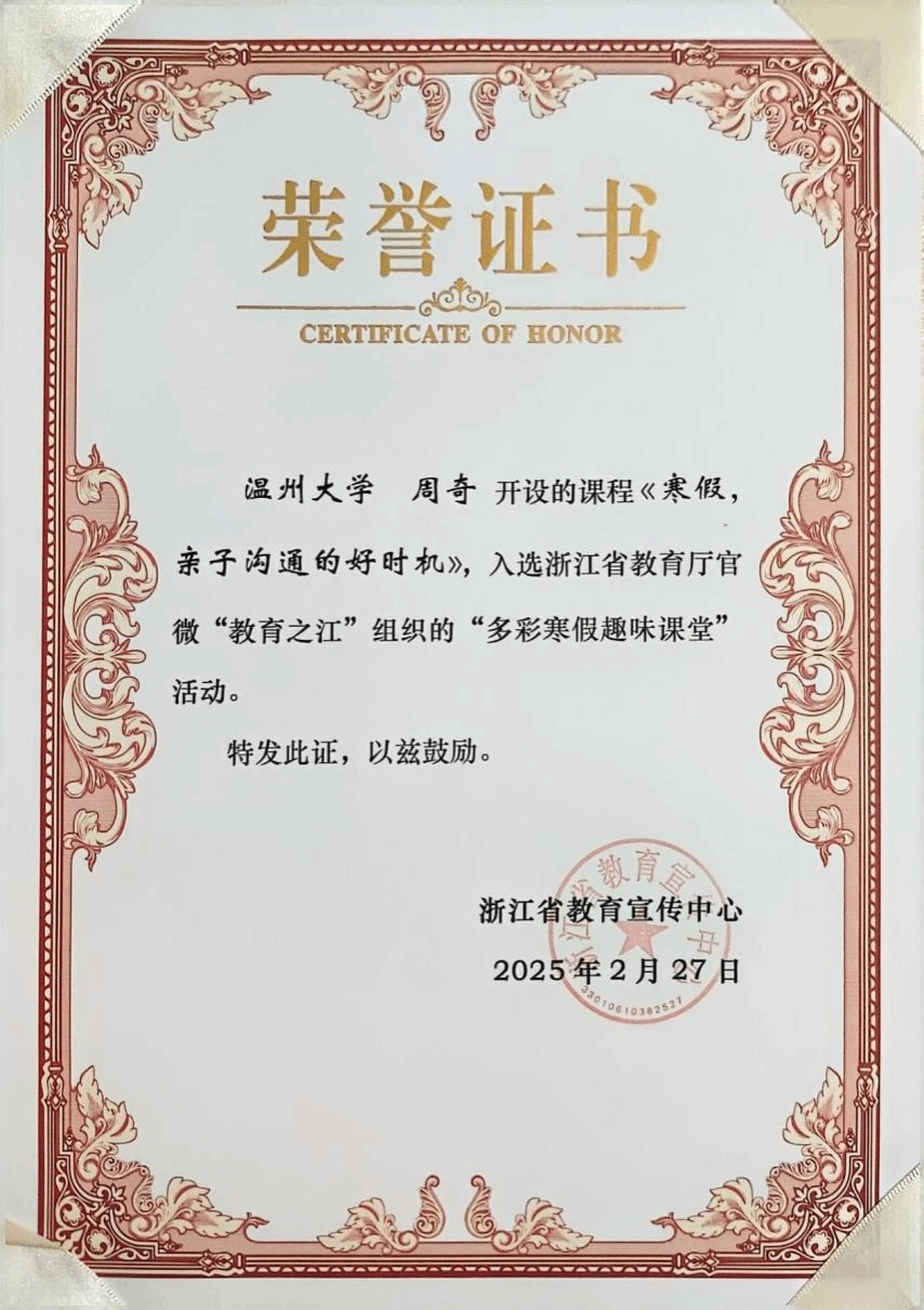 寒假期间,财神捕鱼 周奇老师受邀参加浙江省教育厅官微“教育之江”组织的“多彩寒假趣味课堂”活动,为全省中小学家长做《寒假,亲子沟通的好时机》的家庭教育视频分享。