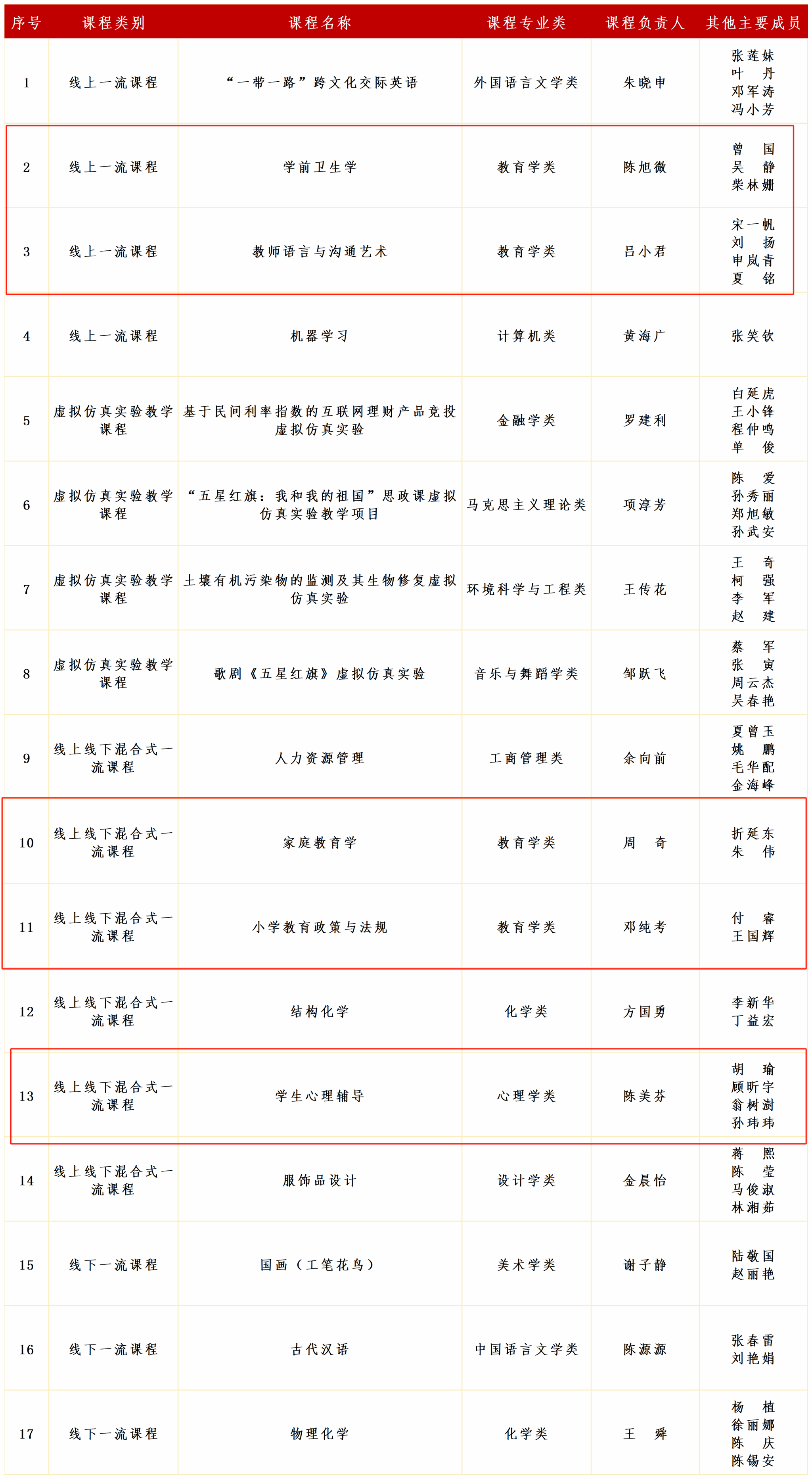 近日,教育部正式公示第三批国家一流本科课程认定名单,财神捕鱼 《学前卫生学》(负责人:陈旭微)、《教师语言与沟通艺术》(负责人:吕小君)2门课程入选线上一流课程,《家庭教育学》(负责人:周奇)、《小学教育政策与法规》(负责人:邓纯考)、《学生心理辅导》(负责人:陈美芬)3门课程入选线上线下混合式一流课程。另外,财神捕鱼 新引进王鹏老师的《心理测量学》入选社会实践一流课程。本次入选课程门数位居全校第一,实现了历史突破,标志着财神捕鱼 在本科课程建设与教学改革方面取得了重大进展。