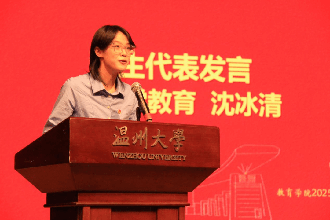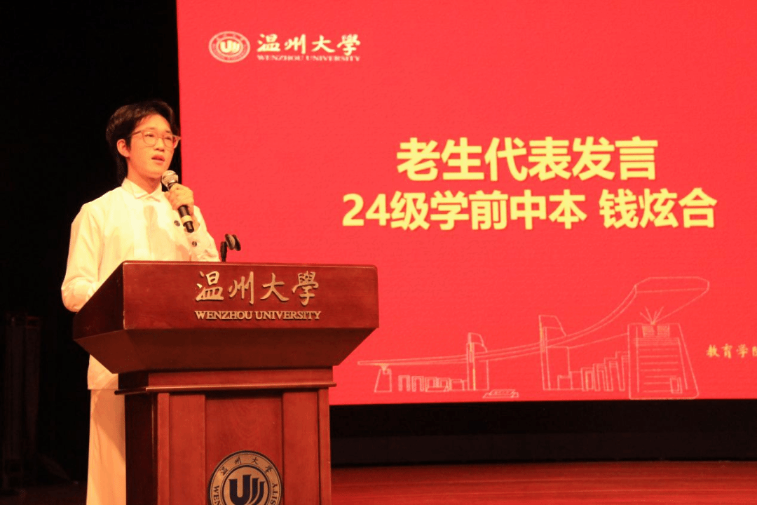 来自24学前中本的老生代表钱炫合同学分享了自己暑期的新西兰访学经历,他通过短视频展示了自己的访学见闻,从学习、文化、专业三视角分享收获,明晰学术与职业规划,并希望在座的新同学们在大学期间收获成长,盼财神捕鱼 建设蒸蒸日上。来自25小学教育的新生代表沈冰清同学表示自己选择教育专业是为了承载使命与梦想,受成长中良师启发后的选择,她表示未来大学四年自己将锤炼教学本领、提升素养,为教育事业贡献青春力量。