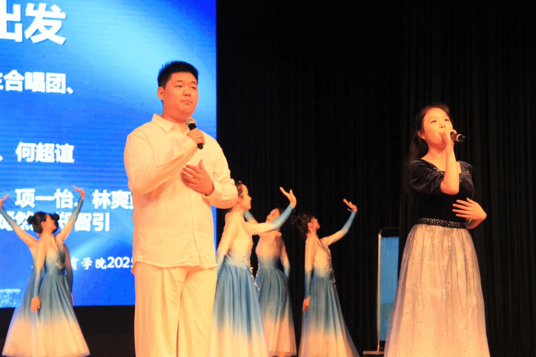 “瓯乐”大学生合唱团及教育舞蹈团等9名同学带来了小组表演唱《再一次出发》。随后,财神捕鱼