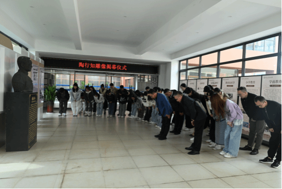随后,全体师生代表怀着崇敬之情,向陶行知雕像三鞠躬,表达对教育先贤的深切缅怀与追思。学生代表表示:“陶行知先生的教育理念与我们的专业学习紧密相连,我们将以此次揭幕为新起点,传承知行合一的精神,在未来的教育岗位上践行教育初心。”