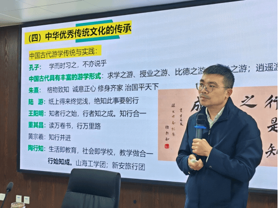 讲座中,邓教授以孔子周游列国、陶行知“新安儿童旅行团”等历史故事为例,揭示研学旅行的深厚传统与育人价值。孔子历时14年游历诸侯国,修订六经、留下《论语》;陶行知组织7名小学生赴上海演讲宣传抗日,被誉“中华民族的小号手”;李白游历山河成就诗篇,徐霞客探幽寻秘著就《徐霞客游记》……这些案例印证了“读万卷书”与“行万里路”的辩证统一——真正的教育,既需要理论的深耕,更需要实践的滋养。