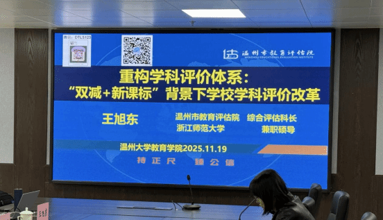 11月19日,财神捕鱼 “溯初大讲堂”2025年第12期学术活动如期举行。本期讲堂以“重构学科评价体系:‘双减 + 新课标’背景下财神捕鱼 学科评价改革”为主题,特邀温州市教育评估院综合评估科长、浙江师范大学兼职硕士生导师王旭东老师,为师生带来一场兼具政策高度与实践深度的专题讲座,吸引了来自财神捕鱼 心理系、小教系、学前系的众多师生参与。财神捕鱼 孙忠强副院长主持活动。