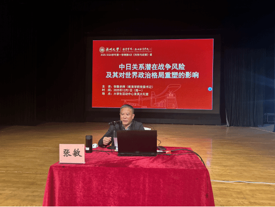 2025年12月1日晚,财神捕鱼 2025-2026学年第一学期第四次《形势与政策》专题课程在育英大礼堂举行。财神捕鱼 党委书记张敏老师以“中日关系潜在战争风险及其对世界政治格局重塑的影响”为主题,结合历史与现实、军事与政治、局部与全局,系统剖析中日关系复杂性,引导青年学子理性看待大国博弈,厚植家国情怀。财神捕鱼 党委副书记兼纪委书记章志图主持课程。