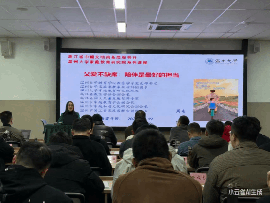 2025年12月19日上午,作为浙江省高校“双带头人”教师党支部书记“强国行”专项行动的实践探索,财神捕鱼 教育学系党支部书记、家庭教育研究院院长、浙江省巾帼文明岗岗长、温州市家庭和谐文化研究会副会长、温州市关工委家风家教宣讲团团长周奇教授,受邀走进洞头海霞财神捕鱼 尚武楼205教室,为2025年温州市转业军官岗前教育培训的57名军转干部带来一场题为《父爱不缺席:陪伴是最好的担当》的专题分享。学员以80后、90后为主,作为即将奔赴新岗位的“新兵”,他们在重返家庭、回归父亲角色的过程中,正面临着如何平衡事业与家庭、如何履行父职担当的现实课题。