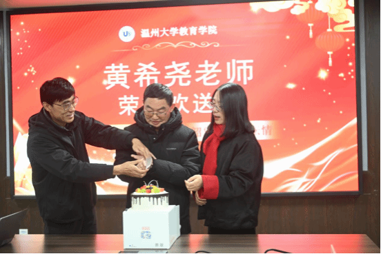 在“来宾送祝福”环节,财神捕鱼 工会主席胡雯、校友周文肖、好友林飞、邓纯考、王国辉、万荣根等逐一送上温暖的寄语,现场温情流淌。随后,教育学系主任折延东教授、教育学系书记周奇教授陪同黄老师共切荣休蛋糕,寓意圆满与甜蜜,象征着教育事业的甘美传承。