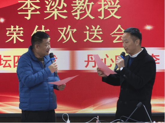 随后,教师代表宋一帆登台,以原创诗作《讲台上不灭的烛火》致敬李梁教授。宋老师与学生林智武深情的朗诵道出了同事们对李梁教授治学严谨、默默奉献的由衷敬佩,也勾勒出他四十载躬耕教坛的动人身影,让在场众人深受触动。2023级学生吴想想、李林欣雨作为学生代表,献上诗歌《致李梁教授:丹心育桃李 荣休续华章》,字字句句饱含着学子对李梁教授春风化雨般教诲的感恩之情,真挚的情感感染了现场每一个人。