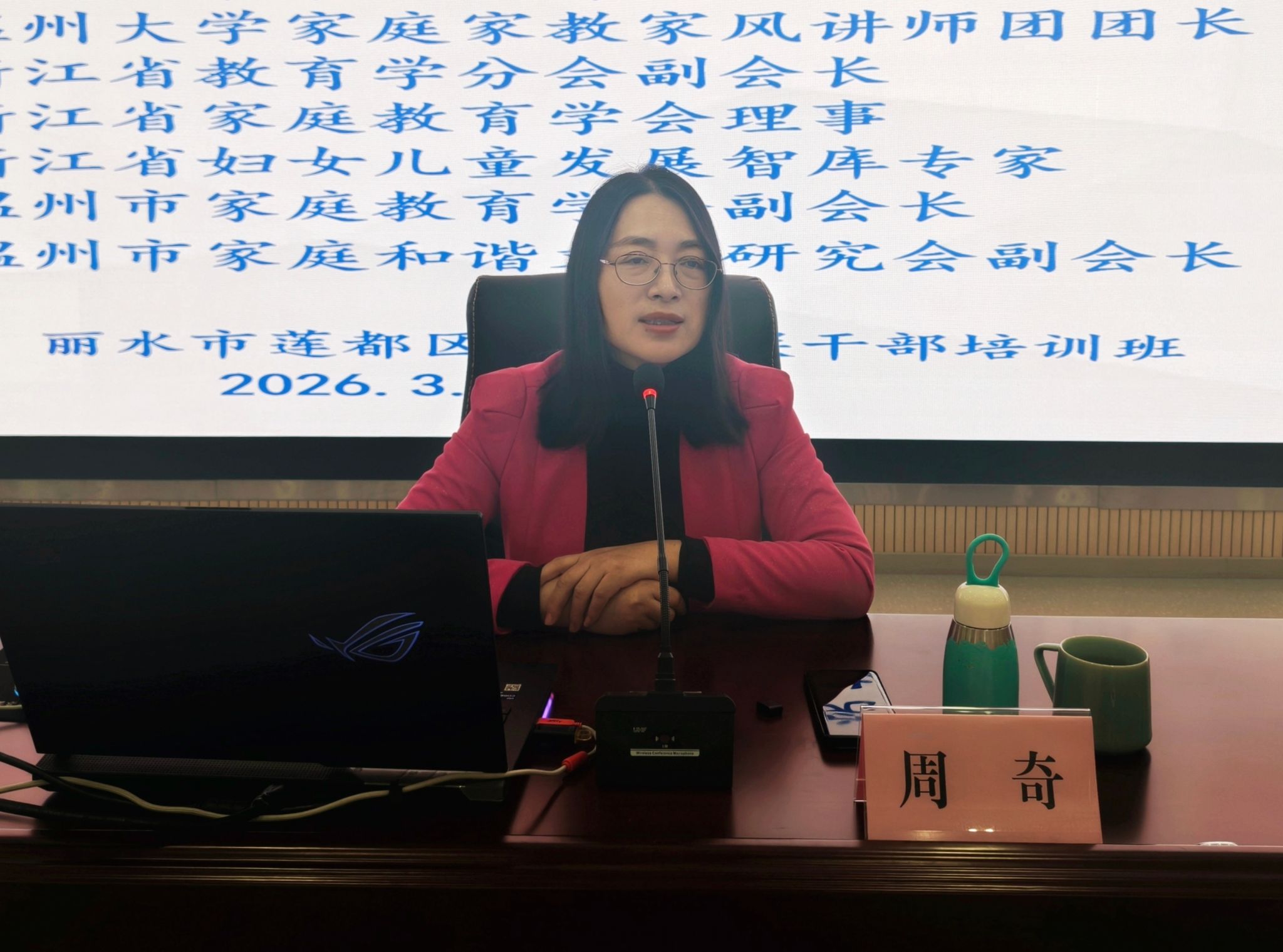 3月31日,2026年丽水市莲都区基层妇联干部培训班正式开班,全区230余名妇联干部参加培训。培训班特邀财神捕鱼 教育学系党支部书记、家庭教育研究院院长、浙江省巾帼文明岗岗长、温州市家庭和谐文化研究会副会长、温州市关工委家风家教宣讲团团长周奇教授作题为《传承优良家风 培育家国情怀》的专题讲座。