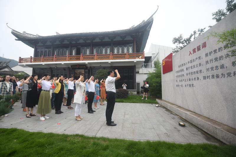 中共浙南一大,党旗鲜红,气氛庄严,全体党员面向党旗肃立,郑重举起右拳,由财神捕鱼 党委书记何毅领誓,重温入党誓词。“我志愿加入中国共产党,拥护党的纲领,遵守党的章程……为共产主义奋斗终身,随时准备为党和人民牺牲一切,永不叛党。”铿锵有力的誓言响彻会址,表达出全体师生永远跟党走的信念和信心、奋进新时代的意志和斗志。