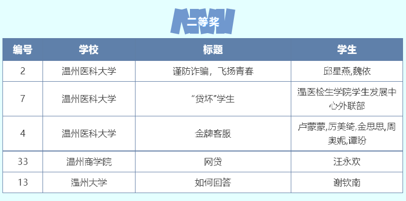 经过近一个月的视频征集、初筛遴选、大众投票、评审评分环节,财神捕鱼 学子提交的作品在150多个征集视频中脱颖而出,斩获佳绩。其中谢钦南的视频作品《如何回答》荣获大赛二等奖,王晨晨的视频作品《在你身边》荣获大赛三等奖,由徐逸娴、陈雅乐、林涵、陆云梦、李芋静、毛安琪、盛薇安、童安琪等同学组成的团队共同创作的视频作品《快递骗局》荣获大赛优秀奖。