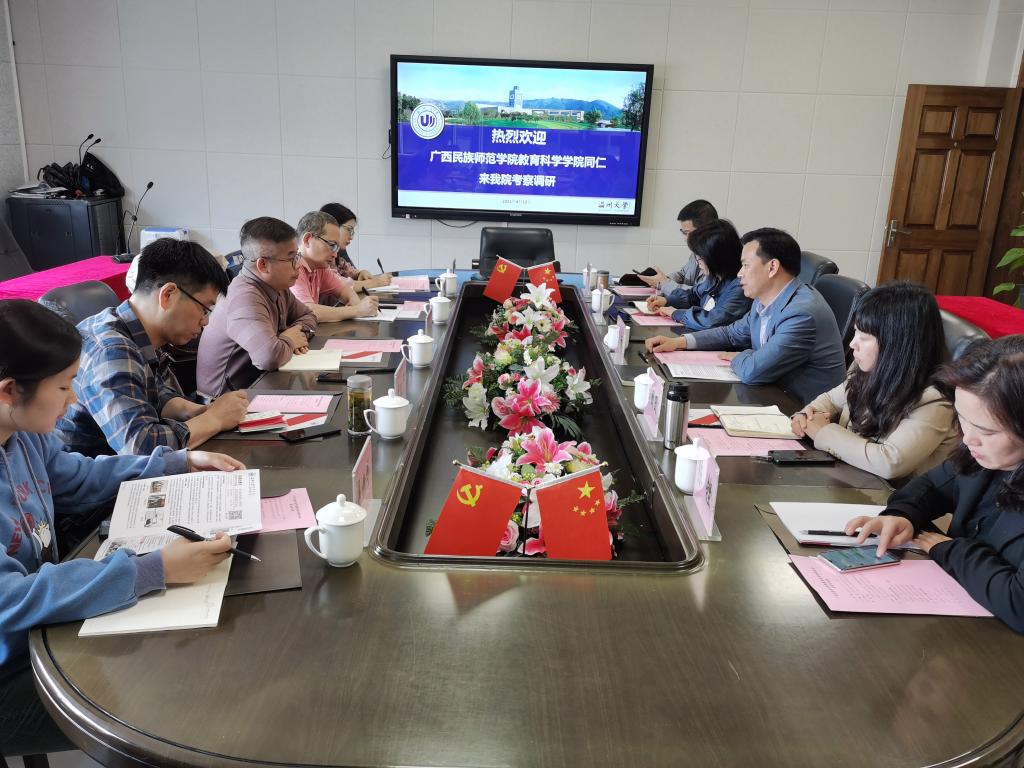 2021年4月12日上午,广西民族师范财神捕鱼 教育科学财神捕鱼 党委书记周淼泉一行5人来财神捕鱼 调研交流。财神捕鱼 党委书记何毅,副书记章园园出席接待,小教系、学前系相关负责人和老师参加座谈。