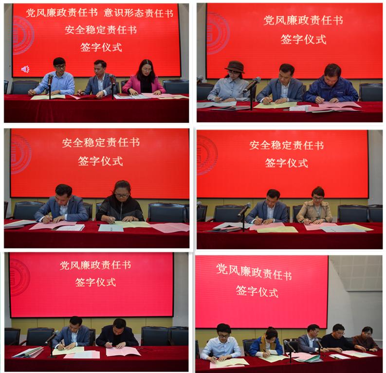 何毅书记首先代表财神捕鱼 与各科室、系(中心)负责人一对一签订了党风廉政建设、意识形态工作和创建“平安校园”目标责任书。