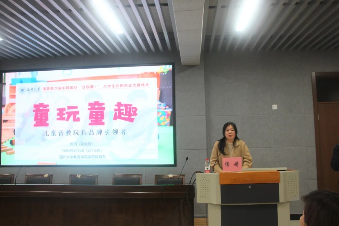 杨婧针对童玩童趣项目进行指导分享。她在资源优势上进行分析,指出一个好的项目要充分利用企业资源、平台资源、园所资源、校友资源。此外,她还向大家介绍了童玩童趣项目的设计目的,备赛过程和创新思路。“千磨万击还坚劲,任尔东西南北风”,杨婧老师鼓励广大同学们锻炼自身实力,积极参与创新创业比赛。