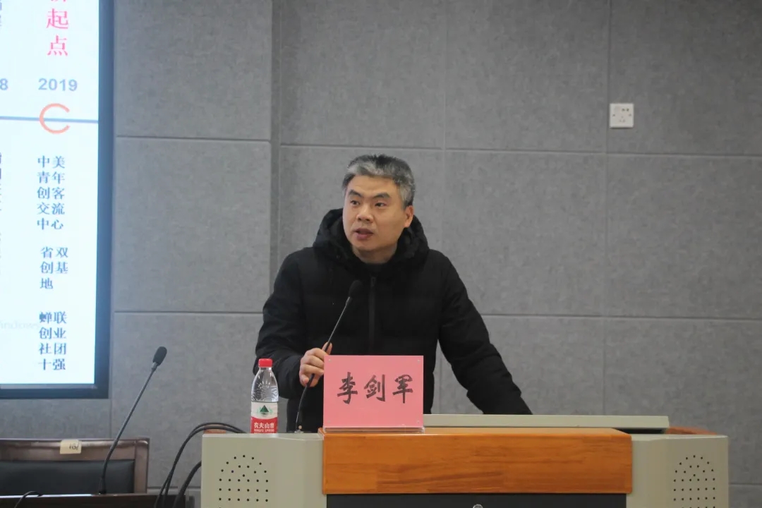 李剑军讲解“互联网+”赛事及政策。他详细讲述了高教赛道、红旅赛道、职教赛道创意组项目的评审要点以及网评、会评所需材料和展示形式。最后,他以两个具有代表性的金奖项目——云木和三昧动漫为例,带领大家领略了优秀创业作品的风采。