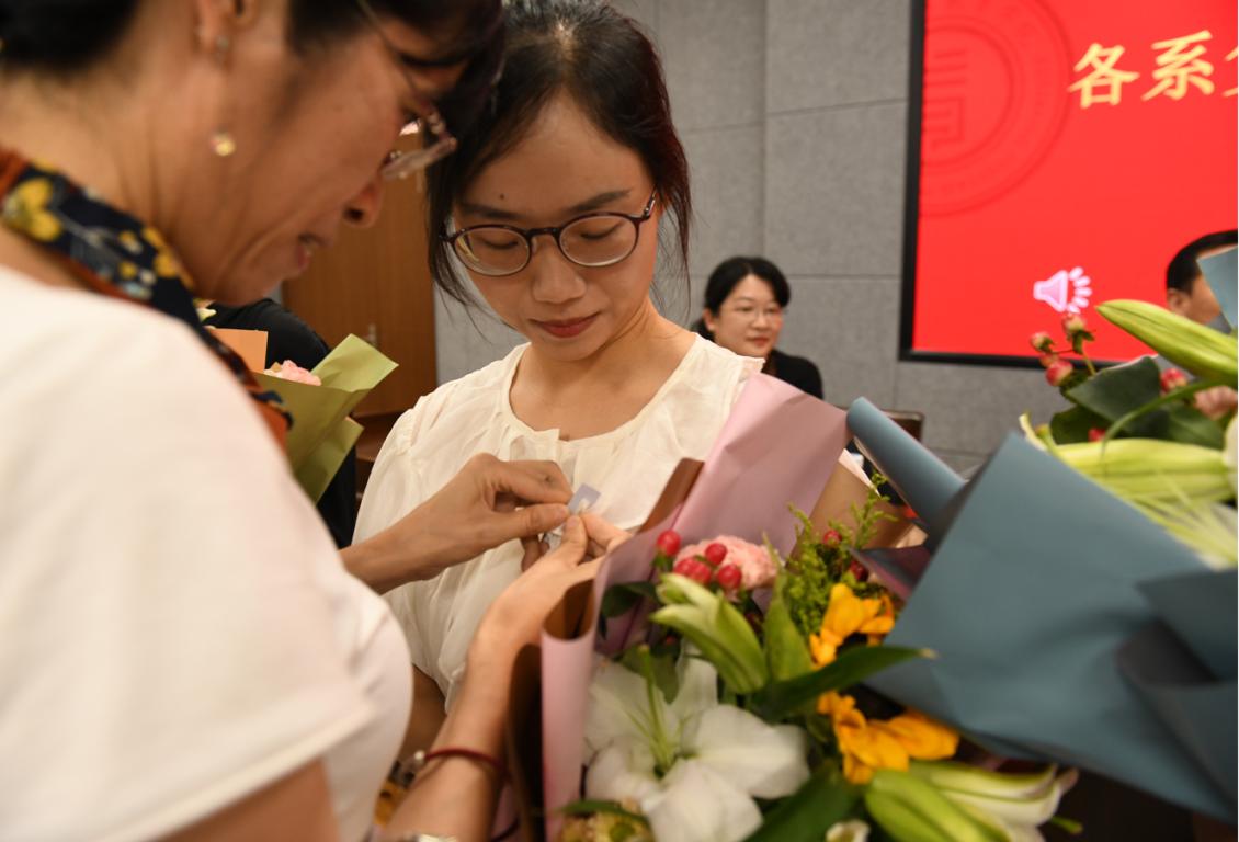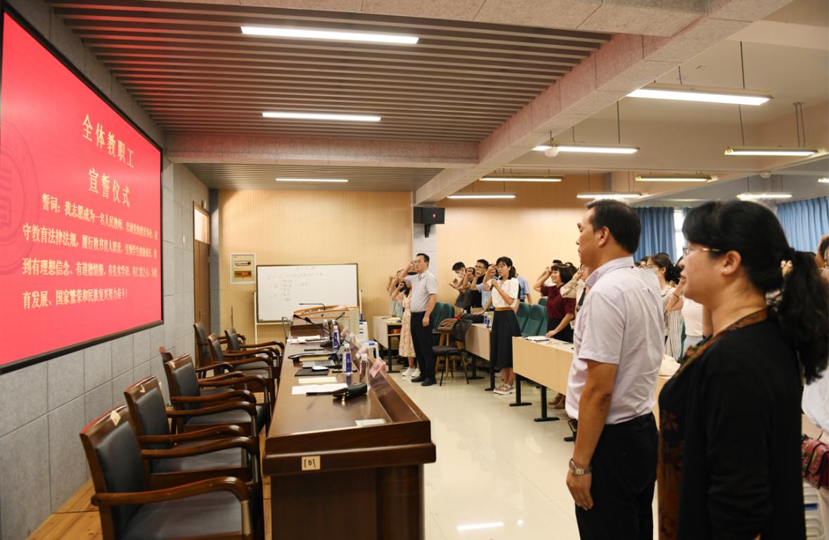 首先进行隆重而热烈的新教师入职仪式。何书记为新入职的6位教师颁发入职纪念证书、师德承诺书以及师德师风建设制度摘要等材料,新教师们怀着激动的心情走上主席台,何书记为新教师一一颁发财神捕鱼 入职“三件套”并合影留念。各系负责人为新教师佩戴校徽,并送上鲜花,表达对新入职老师的热烈欢迎和殷切期望。入职仪式后,全体教师起立,举起右手,进行教师宣誓仪式。作为教育工作者,每年在教师节前夕举行全体教师宣誓是财神捕鱼 师德建设的传统,提醒全体教师时刻不忘立德树人初心,牢记为党育人、为国育才的使命。