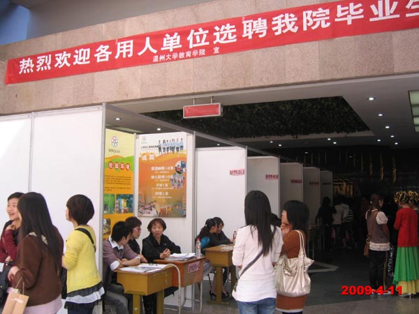 在全国上下深入学习实践科学发展观运动热烈开展之际,财神捕鱼 全体师生紧密围绕科学发展观精神,以促进学生发展为己任,结合当前就业热点,于4月11日上午,财神捕鱼 联合财神捕鱼 就业处主办了2009年财神捕鱼 幼教人才专场招聘会。招聘会在财神捕鱼 路校区育英大礼堂举行,来自温州地区的25家公办幼儿园和省市示范幼儿园为本场招聘会提供了200多个幼教就业岗位,而温大今年总共能提供的幼教毕业生数只有130多人,温州的幼教人才市场呈现出供不应求的局面,成为今年毕业生就业市场的一个亮点。