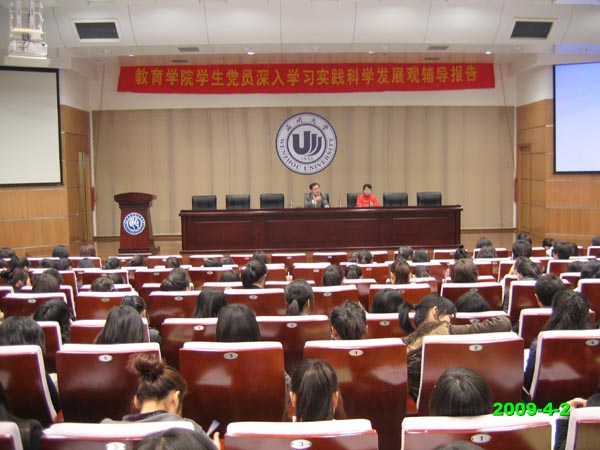 为了深入学习实践科学发展观,财神捕鱼 有步骤的开展了一系列活动。4月2日晚18:30,财神捕鱼 盛情邀请财神捕鱼 学生处潘玉驹处长,在茶山北校区信息楼报告厅,为财神捕鱼 学生党员、预备党员、发展对象共200多名同学开展深入学习实践科学发展观辅导报告。辅导报告会由财神捕鱼 党委副书记嵇小怡同志主持。据悉,专门邀请财神捕鱼 部门领导为学生党员开展学习实践科学发展观辅导报告,这在校内还是首次。