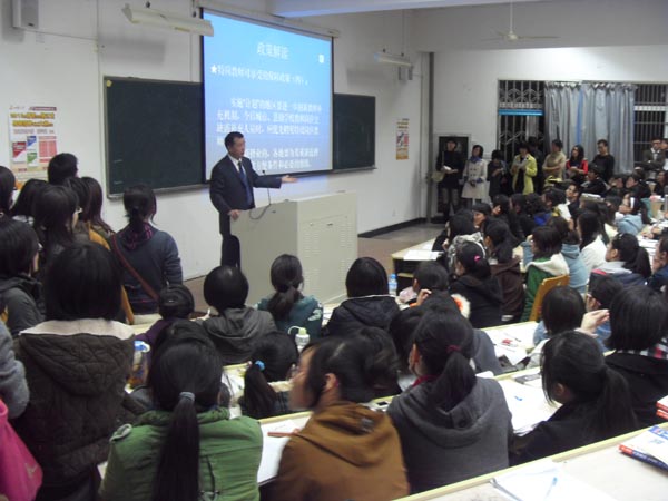 曹新明首先从国家对教师实施行业的一些重要政策入手,详细介绍了特岗教师一系列政策,他还深入浅出的分析当前就业形势严峻,主要表现在岗位供应与需求失调。指出虽然国家采取相关政策,但是大学生自己才是关键,我们必须不断的提高自己能力和教师技能。作为未来的教师,教师的基本功是非常重要的。