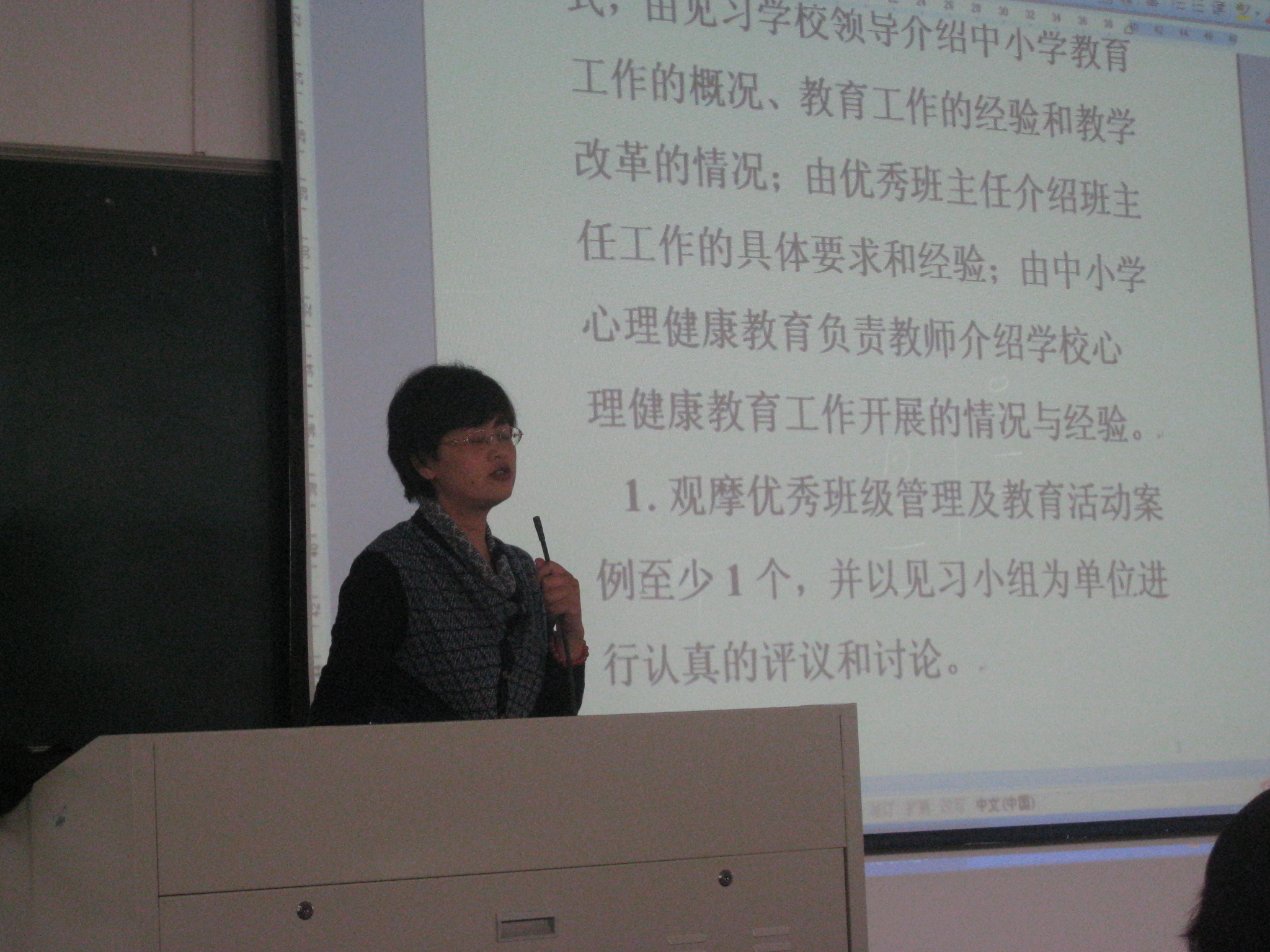 其次、朱倩云老师对具体见习的内容做了如下布置:听课任务、还原教案、参加心理健康活动的观摩、调研报告、见习总结(心得),并对见习成绩的评定做了说明。在接下来的环节,朱老师对学生的疑问,做了详细的解答。