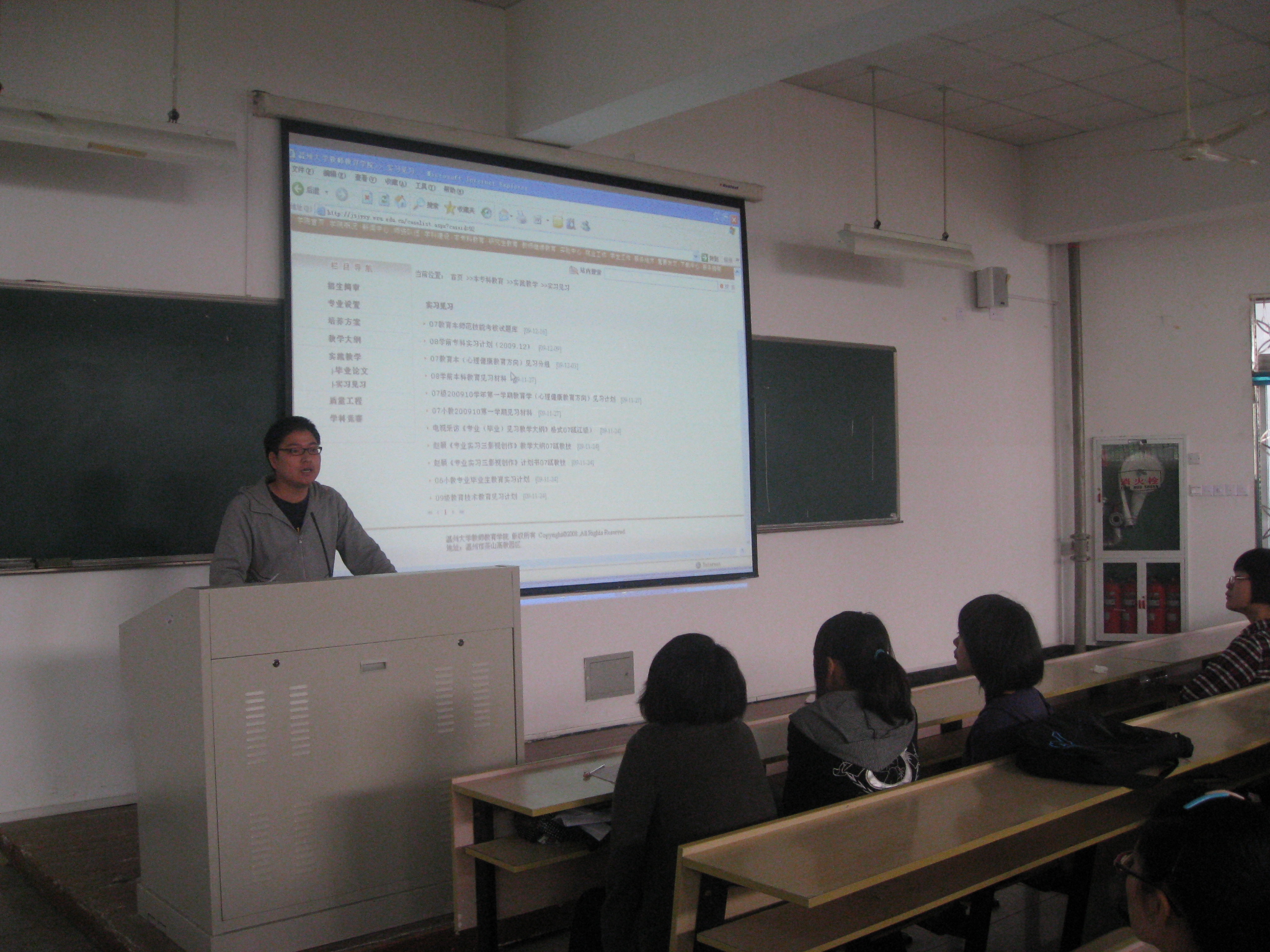 4月23日下午3:30,08教育本班级在北校3号楼101教室召开见习动员大会。会议由教学科胡孙贵老师主持。08教育本40位同学参加,出席会议的还有心理系实践工作负责人朱倩云老师、教学科副科长周领老师。