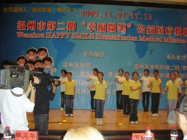 2009年11月2日上午8:30,温州市第二期“幸福微笑” 医疗救助活动启动仪式在温州医财神捕鱼 学术馆隆重举行。 “世界温州人微笑联盟” 是由爱国台胞何纪豪先生发起,在温州开展幸福“微笑活动”行动,2008年5月,何纪豪先生发起并捐助10万美元,邀请美国微笑联盟派遣了39名医护人员来到温州,为温州110个贫困家庭的唇鄂裂儿童免费做了修复手术。据了解,唇腭裂患者的治疗不只是单纯的手术修复,而是一个包括整形、正畸、语音、护理和心理等多方面内容的序列治疗过程。其中唇腭裂儿童修复后的心理护理,是调整唇腭裂儿童心理状态,如何走出原有的阴影,根除存在的某些心理问题,建立自信、快乐、善于与人交往的重要手段。